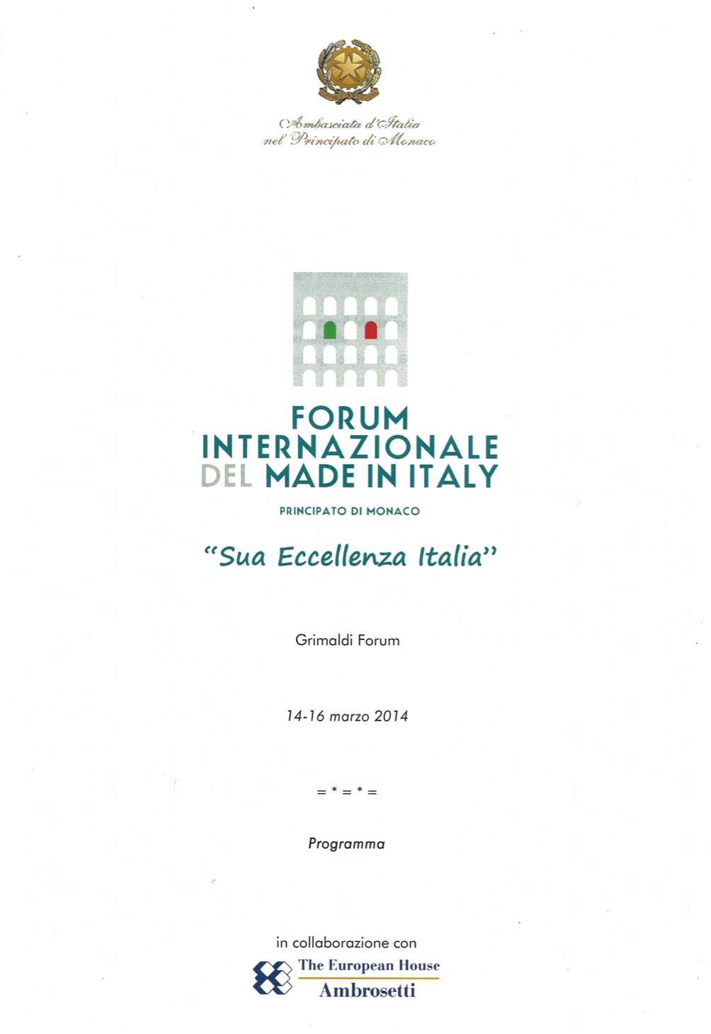 Playing on the word ‘excellence/excellency’ and the possessive in Italian that can be ‘his’, ‘her’, or ‘its’, the Forum’s title was “Your Excellency, Italy” or “Its Excellence, Italy!” Thanks to the good work of Italy’s Ambassador to Monaco, Antonio Morabito, and his team.