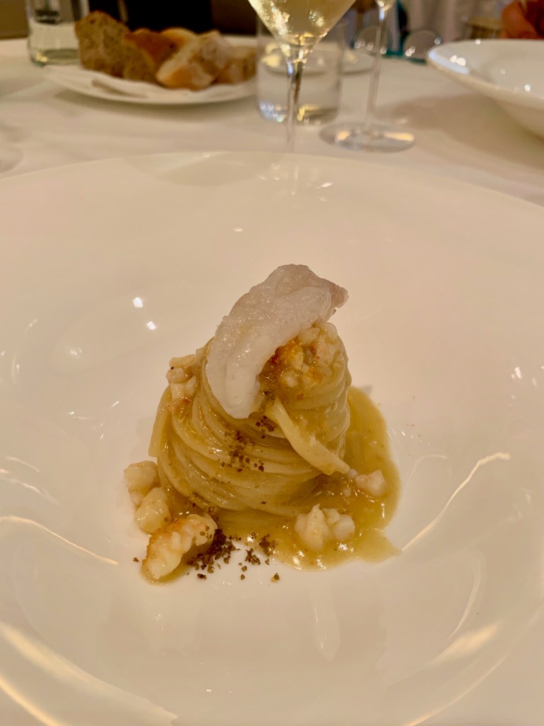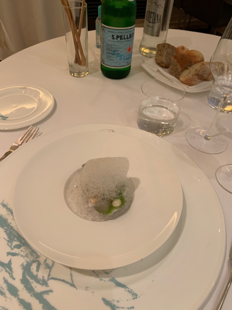 Like eye-popping fireworks – and it’s not for nothing that the Italians are the greatest firework makers in the world too – the courses in this tasting menu kept on coming, and kept on astonishing. Let’s face it: Italians know how to pull out the stops no matter what the field. Just when you thought you’d seen it all, oops! They did it again… Here to the left, the welcoming oyster with the pearl, and a lovely dose of seafoam on top!