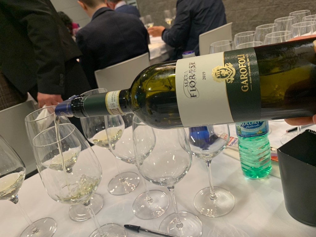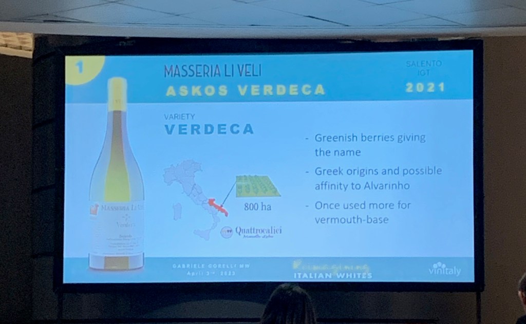 The first wine was surprisingly from Puglia, a region known for its reds, with a Verdeca from Masseria Li Veli. Owned by a Tuscan family from Gorelli’s native Montepulciano, Li Veli made this Askos Salento IGT 2021 vintage in a smart style, to let people drink and enjoy the salty minerality.
