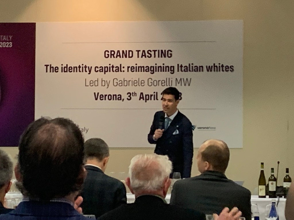 Re-imagining Italian Whites: this was a Master Class appropriately enough held by a Master…. of Wine. Gabriele Gorelli MW treated us to an informative, dare I say entertaining?, presentation of the unexpected: Italian whites. This was an unusual Vinitaly all around, from the freezing temperatures like some kind of April Fools joke, to a general fair-wide focus on white wine. Surprising from start to finish.