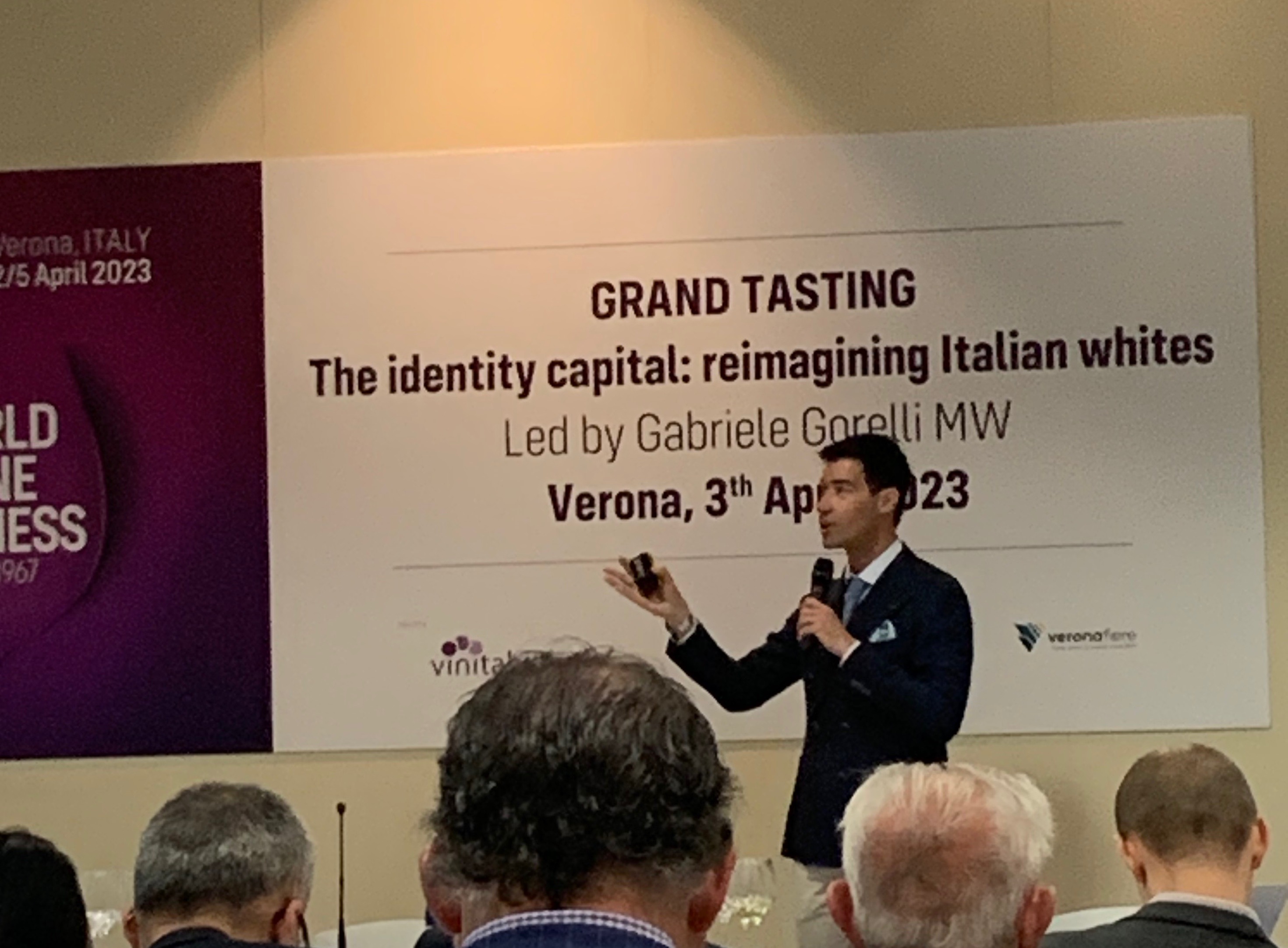 Re-imagining Italian Whites: this was a Master Class appropriately enough held by a Master…. of Wine. Gabriele Gorelli MW treated us to an informative, dare I say entertaining?, presentation of the unexpected: Italian whites. This was an unusual Vinitaly all around, from the freezing temperatures like some kind of April Fools joke, to a general fair-wide focus on white wine. Surprising from start to finish.