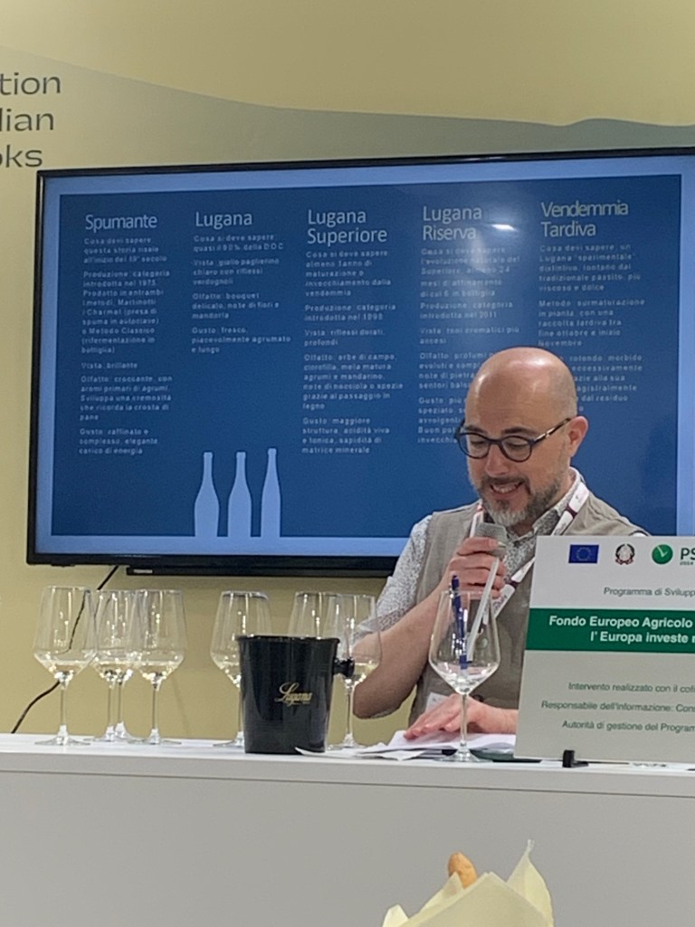 Lucky me got to participate in a tasting sponsored by the Consorzio Tutela Lugana DOC at this year’s Vinitaly. Led by wine expert at large, Filippo Bartolotta, this was one stylin’ tasting! Get a load of those graphics – so chic!