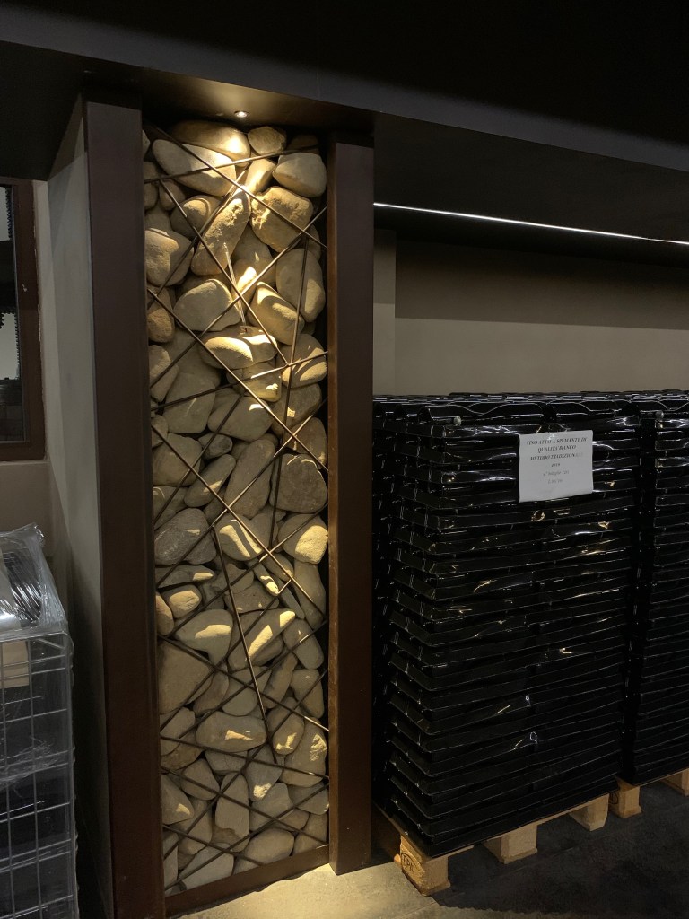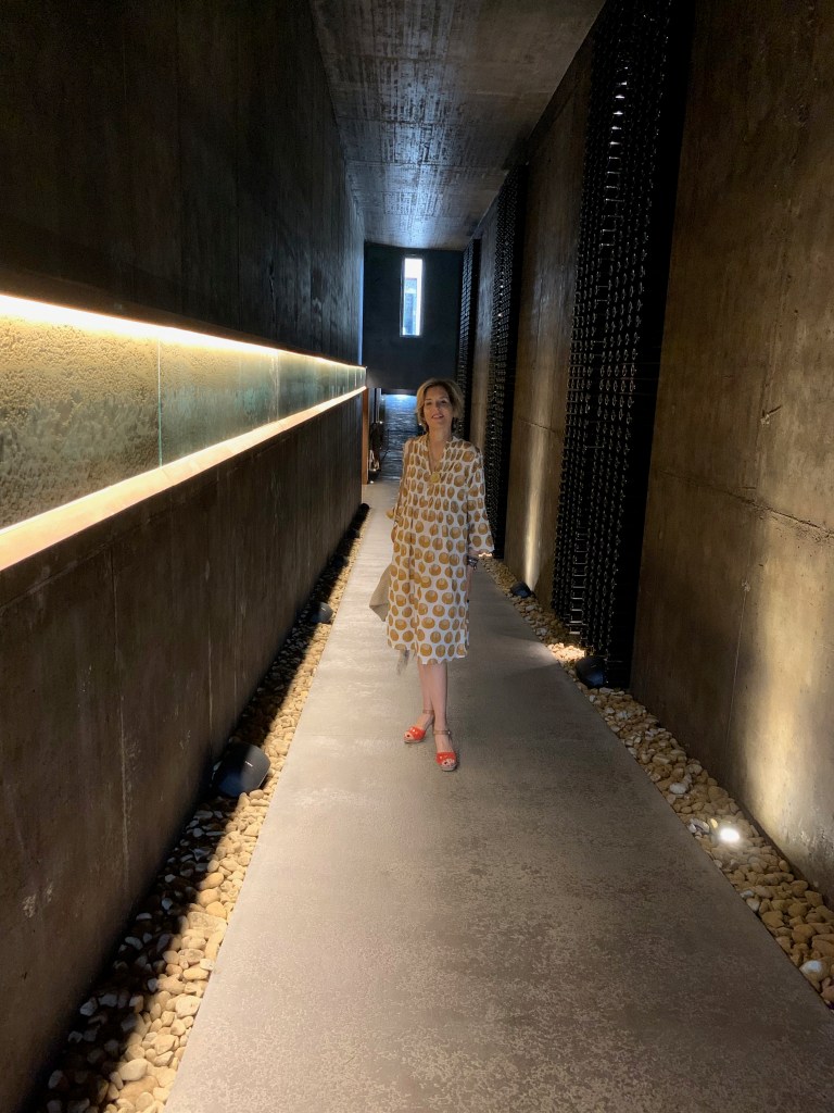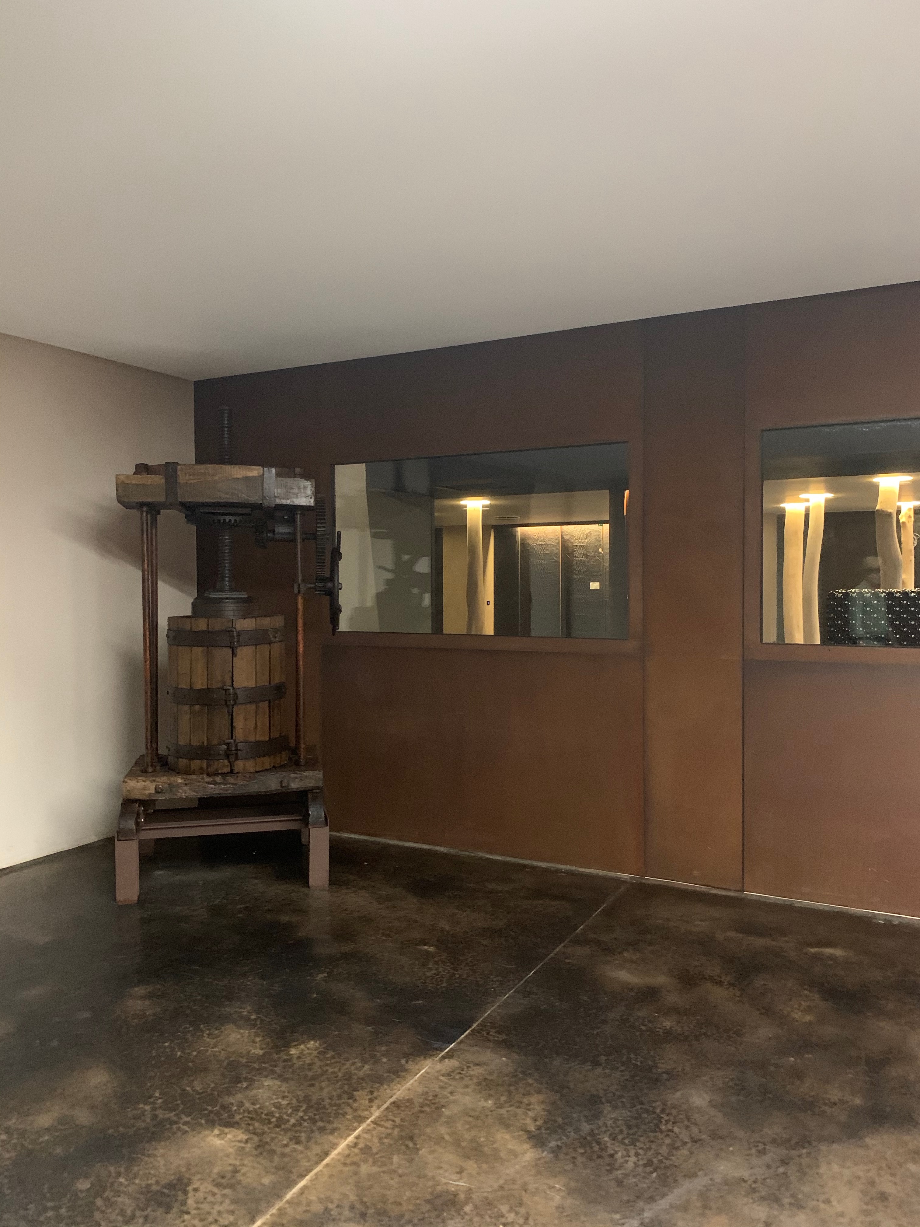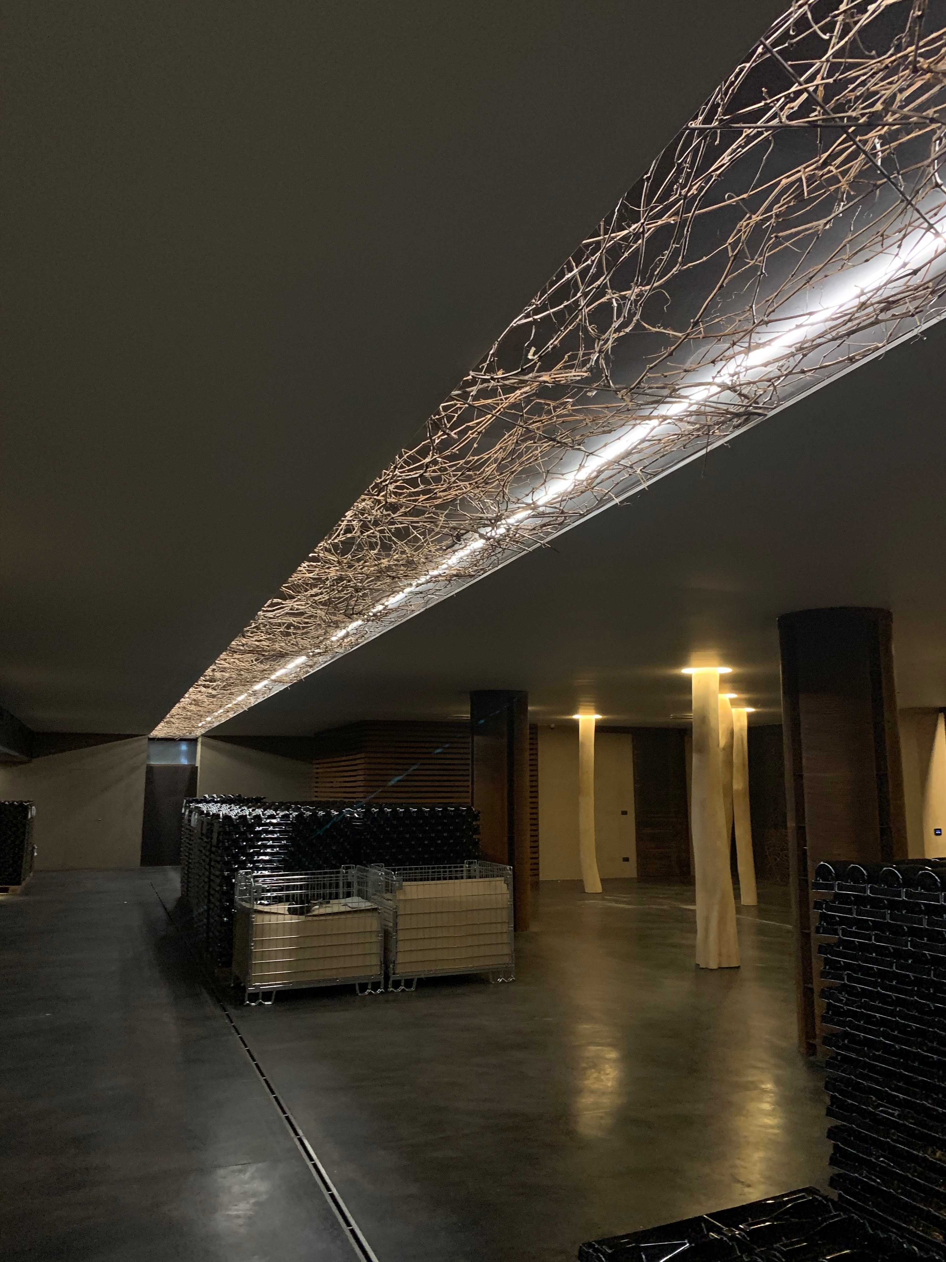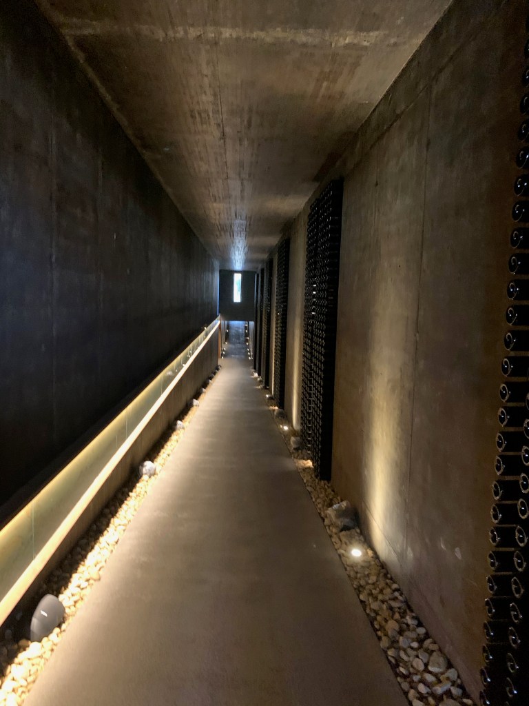 A very theatrical entrance leads one to descend into the cellar; the lighting is dramatic, and the soils are on display.