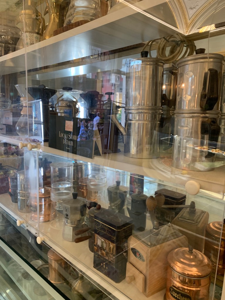 Coffee is another specialty of Naples, as the display of pots here at world-renowned Gran Caffè Gambrinus demonstrates. The Neapolitans like their coffee sweet and have a ritual preparation with sugar to make the cuccuma, the sweet creamy part!