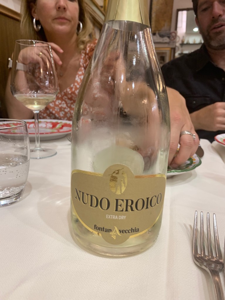 When a press trip starts off with a wine called Nudo Eroico (i.e. heroic nudity, translator’s note!) you have no idea how you are going to wind up! Our inaugural dinner featured this sparkling Falanghina wine produced by the President of the Consorzio del Sannio, Libero Rillo (a tongue-twister of a name!) whose family owns the Fontana Vecchia winery.