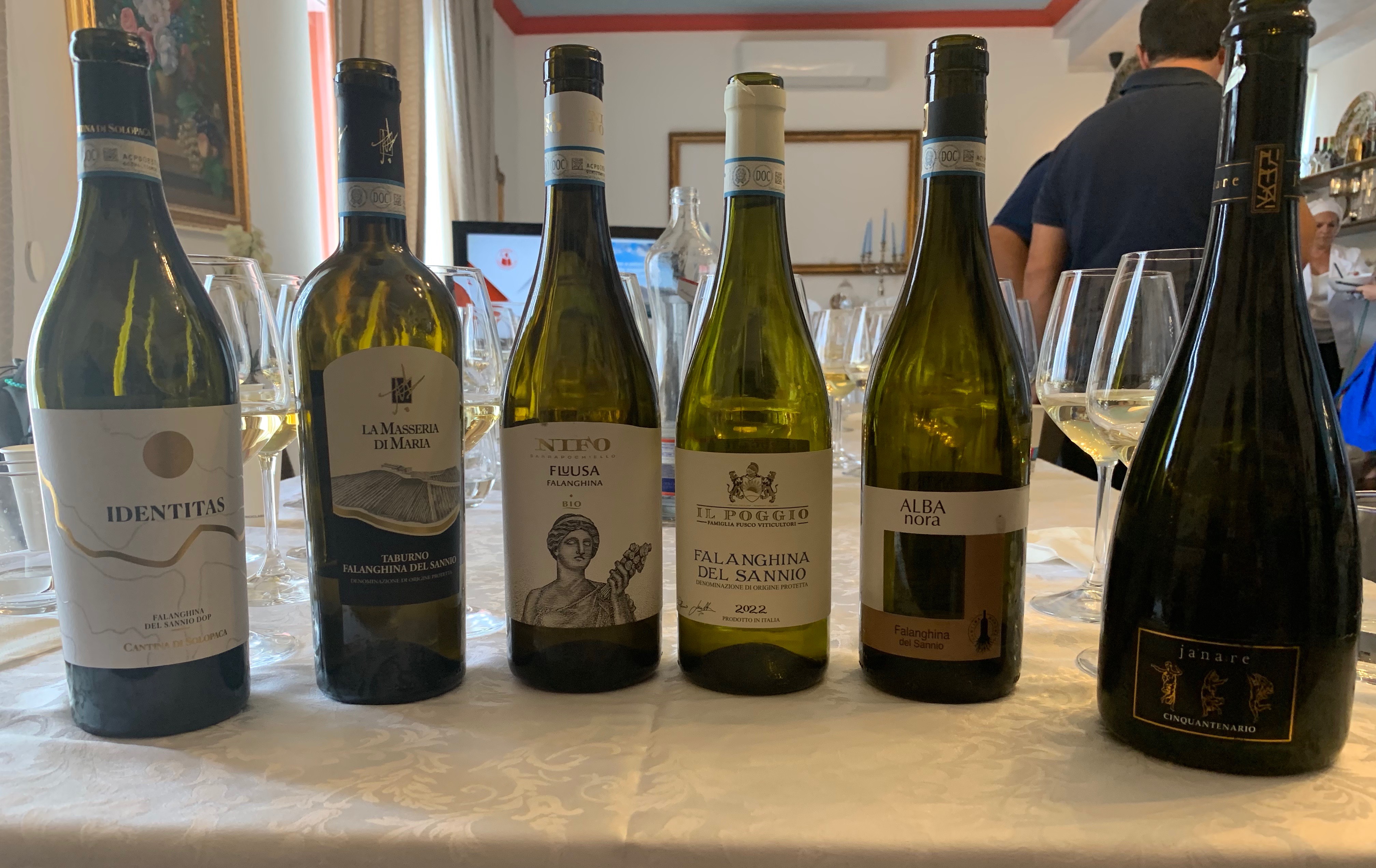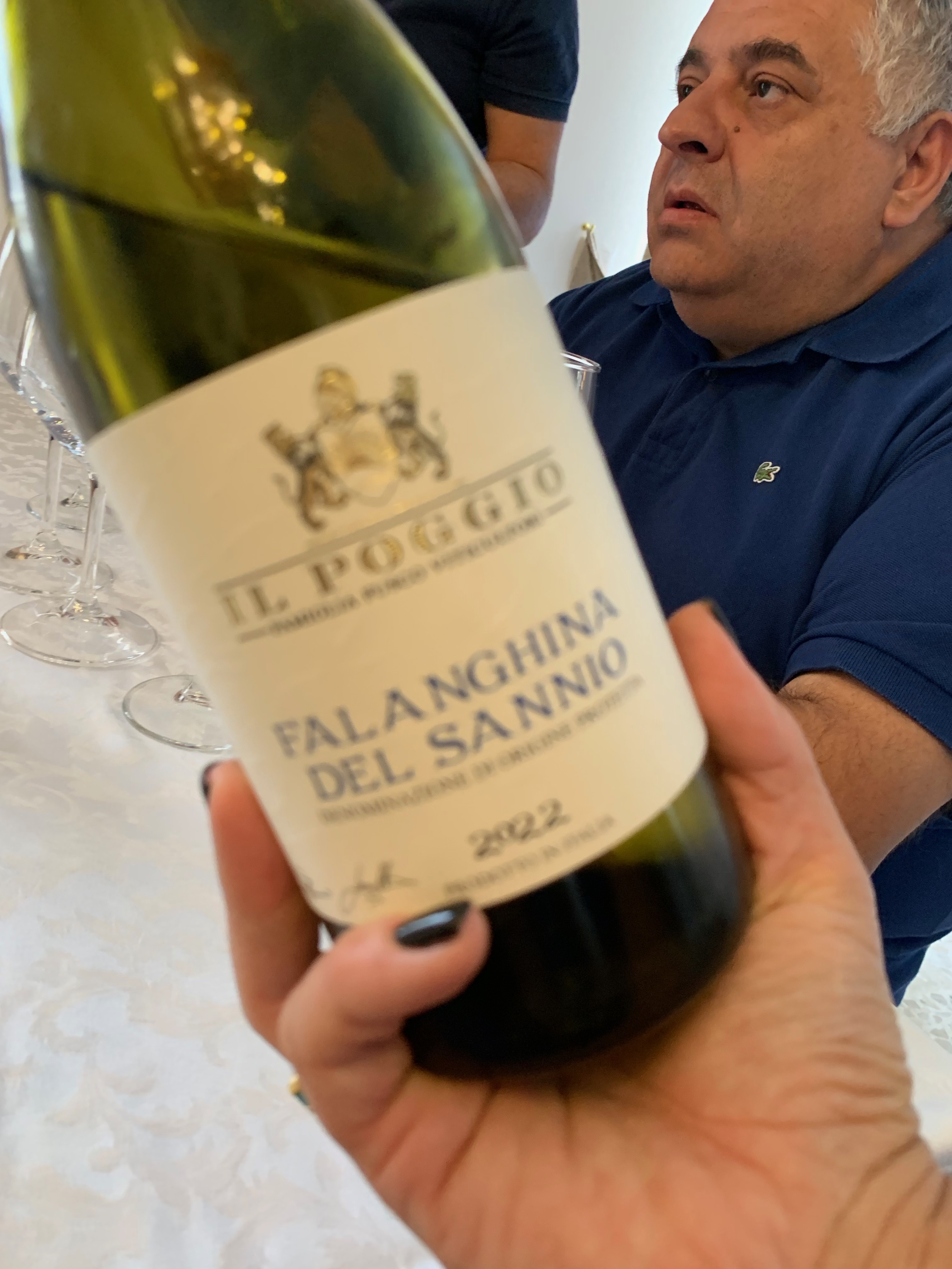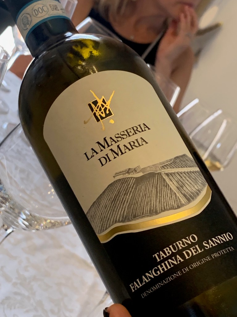 The tasting: our first wine was made by the Cantina di Solopaca, a large cooperative from the town of Solopaca, located in this Land of the Samnites (an ancient tough and war-mongering Italic tribe dating to 1000 BC!) Identitas Falanghina del Sannio DOP, like its name states, represents the territory with a pineapple nose and fresh appeal. The next three wines were from the Taburno area: the first, La Masseria di Maria Taburno Falanghina del Sannio DOP showed great complexity on the nose, with pine forest, pineapple, vanilla, chamomile, saffron, green pear, stone fruit and a balsamic note. The third wine, Il Poggio Falanghina del Sannio 2022, was an intense gold yellow color and on the nose showed eucalyptus, pineapple and pear drop; on the palate a hint of flint and minerals. By the time we got to Nifo Sarrapocchiello Fluusa Falanghina Bio, an organic wine with a beautiful label, something had me thinking Asian cuisine. Nice mouthfeel and a lovely aftertaste of exotic fruit, some of the warmth here can be attributed to the 14% abv. Our host’s Alba Nora Falanghina del Sannio with a deep yellow color had a distinctively sweet nose with vanilla, some stone fruit or even stewed apricot nice acidity and salinity. But the real surprise was the Janare Cinquantenario Metodo Classico Millesimato 2018 (the year was not that evident on the label). Fifty 5 – 0 months on the lees, with the dancing witches of Benevento on the label, this wine may be described in a word: WOW!
