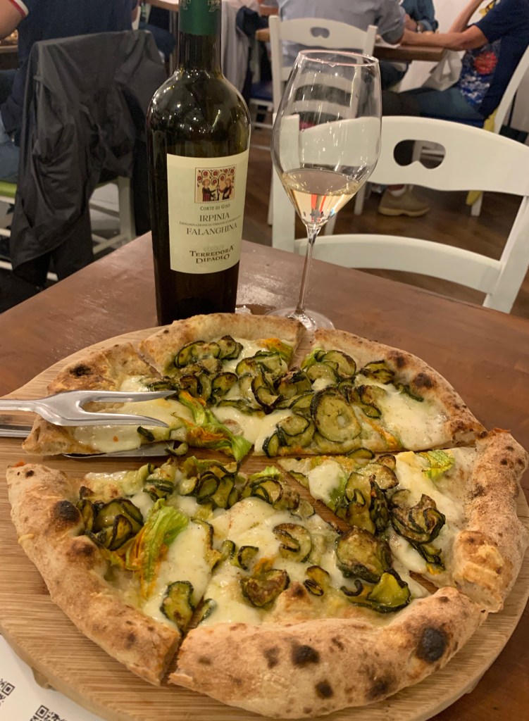 And who says pizza and beer is the winning combo? I love my pizza with wine, and this was a scrumptious pairing where the Falanghina completed the tastes of both veggie pizzas beautifully. This part of the world loves the combo of zucchini and cheese: one pizza was almost an interpretation of pasta alla Nerano, with the fried zucchini and a mix of cheeses, strictly white pizza.