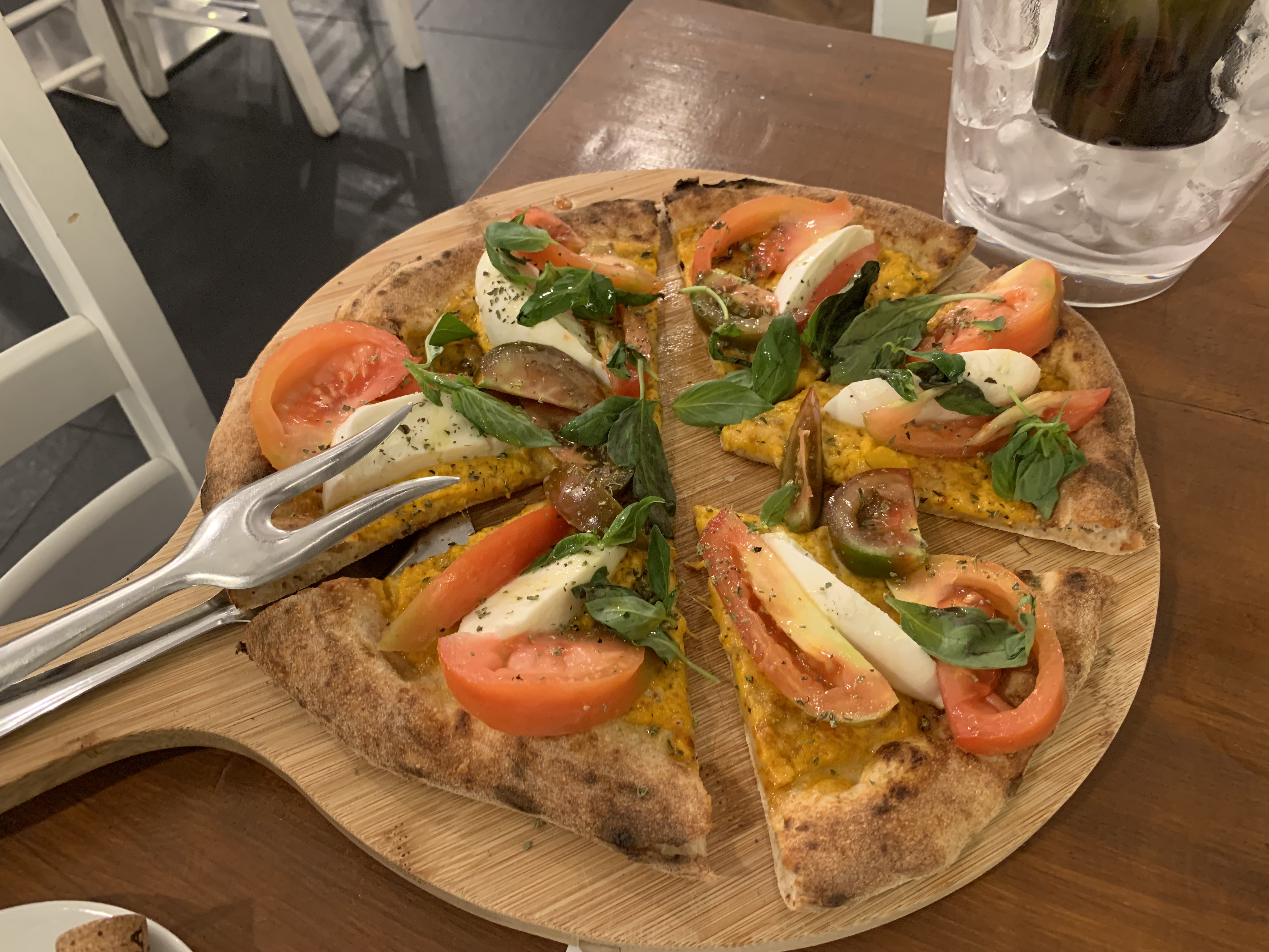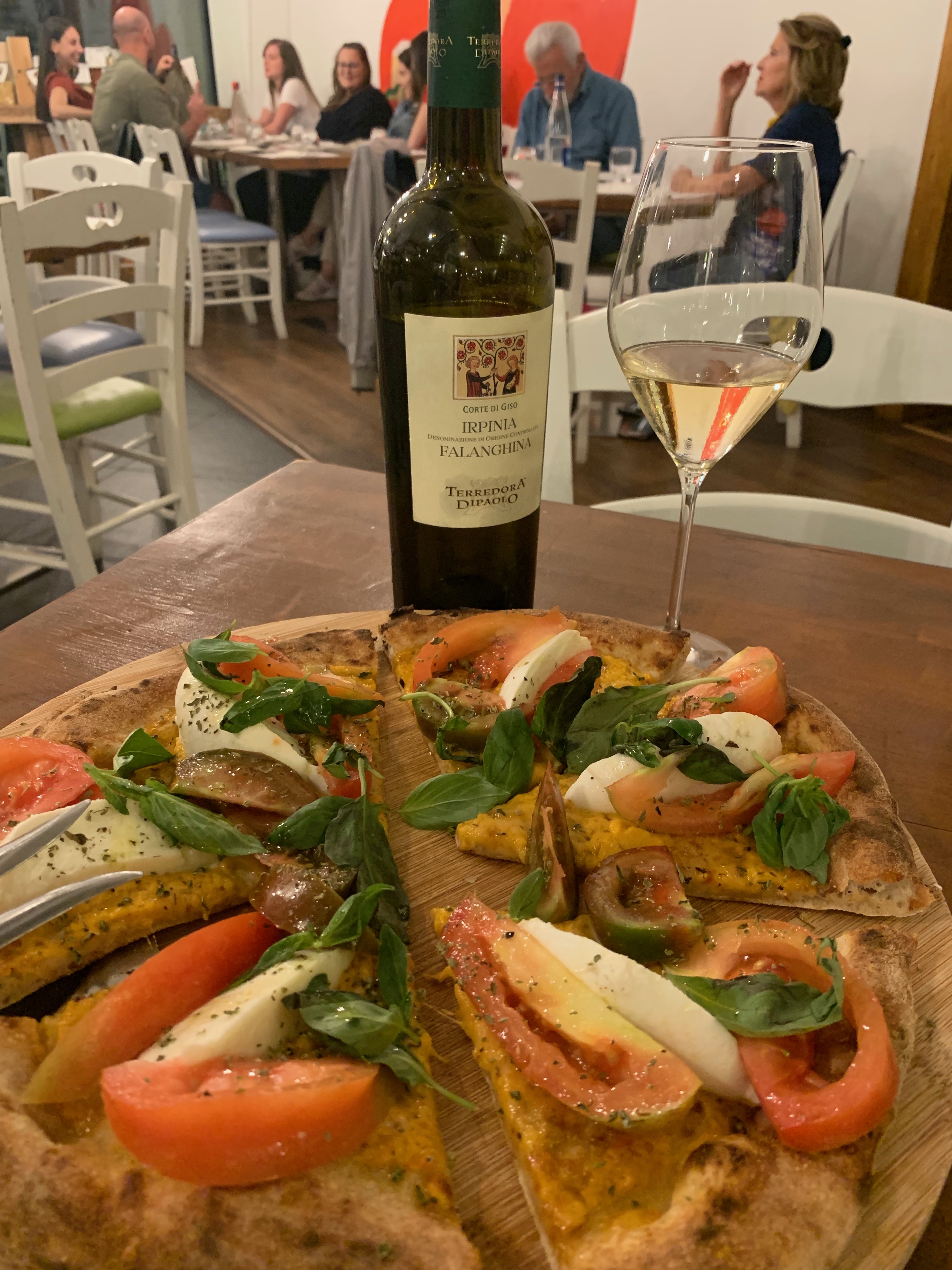 And who says pizza and beer is the winning combo? I love my pizza with wine, and this was a scrumptious pairing where the Falanghina completed the tastes of both veggie pizzas beautifully. This part of the world loves the combo of zucchini and cheese: one pizza was almost an interpretation of pasta alla Nerano, with the fried zucchini and a mix of cheeses, strictly white pizza.